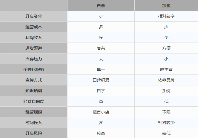 時(shí)尚貨架根據(jù)母嬰店的開(kāi)店準(zhǔn)備和后期運(yùn)營(yíng),將加盟母嬰店和自營(yíng)母嬰店的區(qū)別總結(jié)成一個(gè)表格,希望可以對(duì)你有所幫助: